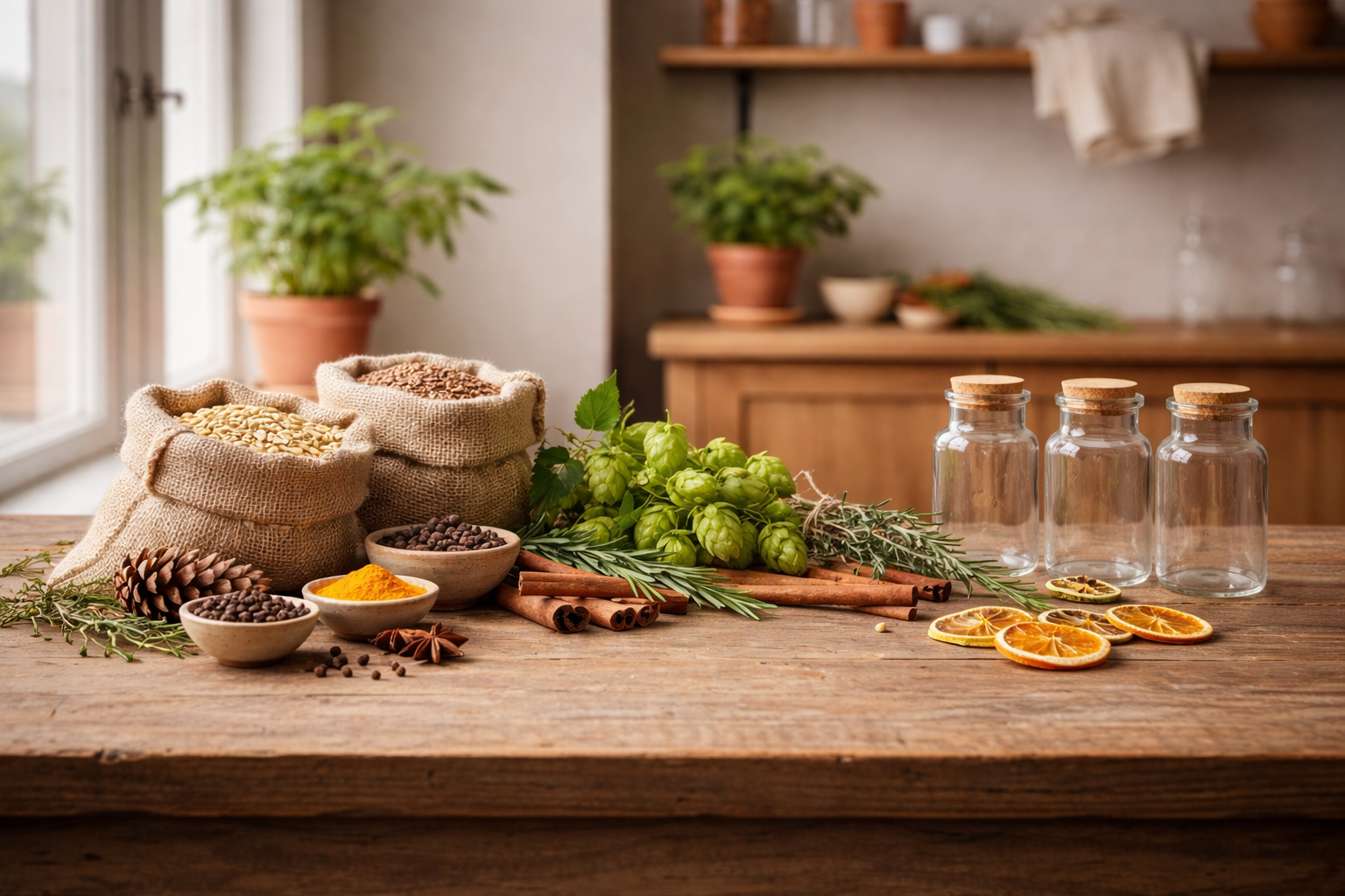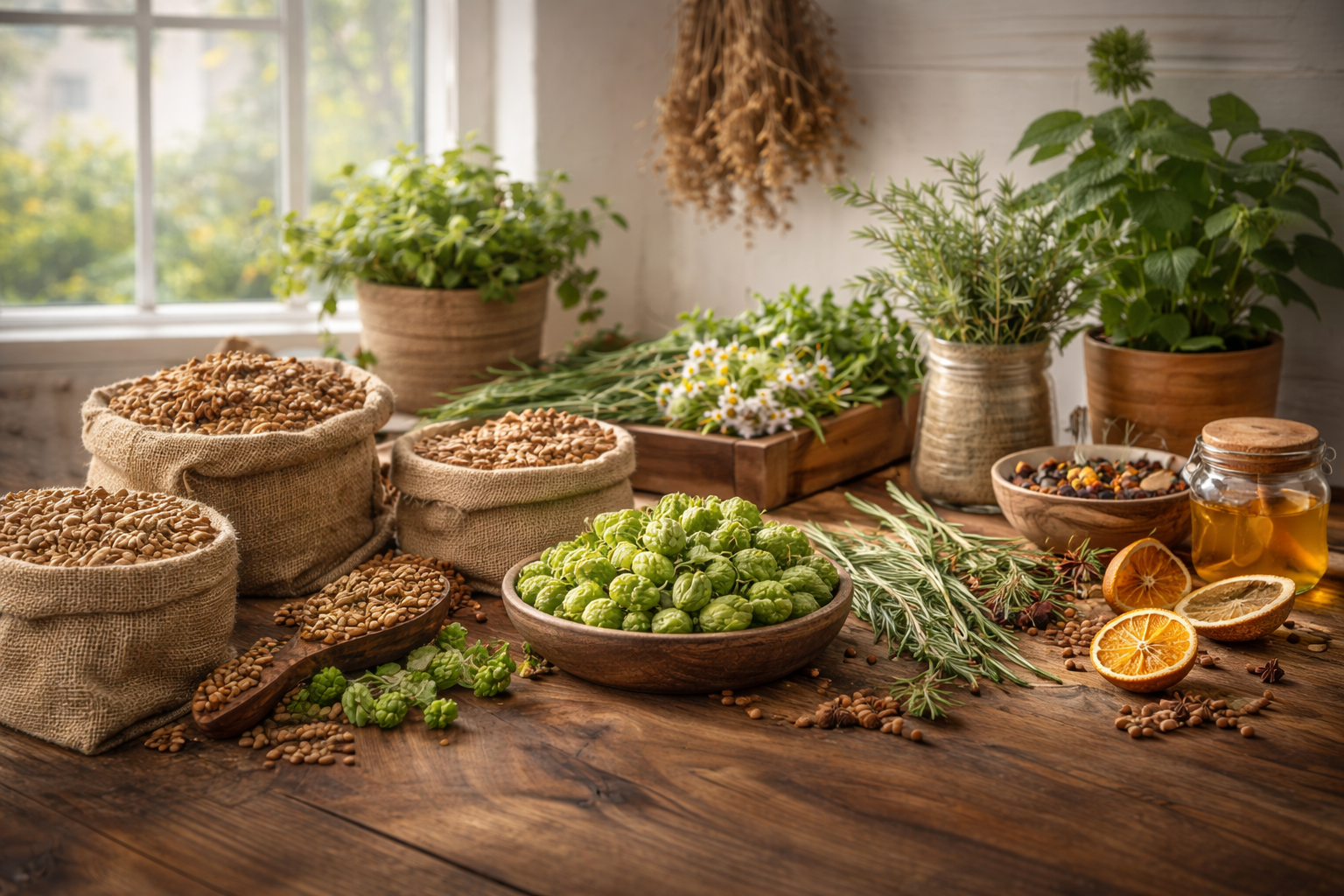 Bryggeingredienser som malt, humle og gjær, i tillegg til bryggetilsetjingar og utvalde urter, te og krydder for smaksetjing.